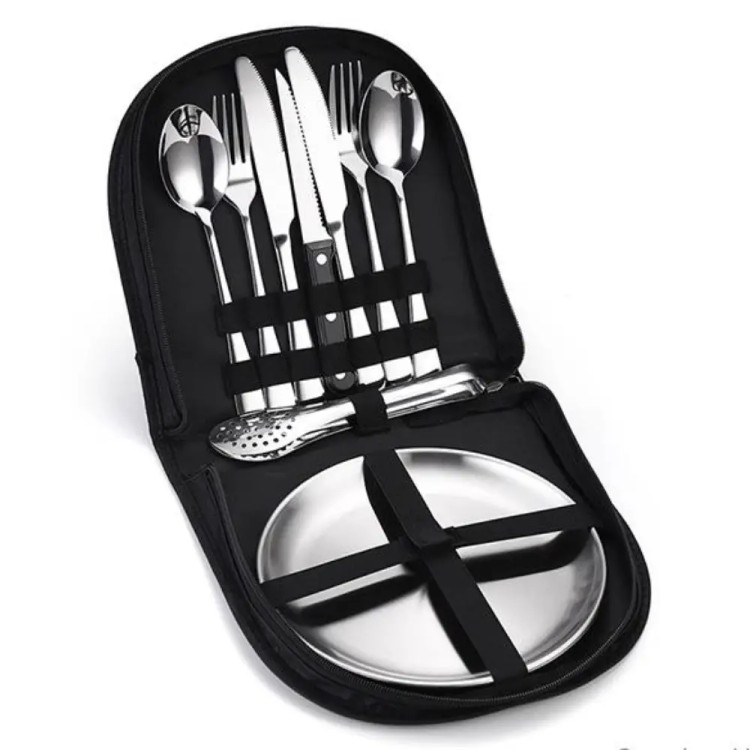 محتویات: ۲ عدد بشقاب سایز ۲۰ استیل ۲ عدد قاشق استیل ۲ عدد کارد چنگال ۲ عدد 2 عدد قاشق چایی خوری یک عدد انبر و کیف زد اب قابل حمل